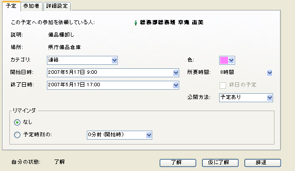 予定時刻の前にスケジュールを知らせるリマインダ機能で参加者に会議の開催を再確認させることができます。 携帯電話への転送も可能なので、予定を忘れる心配はありません。